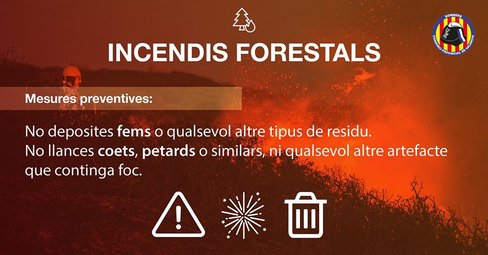 • La Concejalía de Medioambiente comunica que, por resolución de la Conselleria de Agricultura y Medioambiente, quedan suspendidas las quemas agrícolas, forestales, de cañares, carrizales o matorrales desde el viernes, 1 de junio, y hasta el 16 de octubre, ambos días inclusive, en los terrenos forestales, en los colindantes o con una proximidad menor de 500 metros de aquellos debido al peligro existente de incendio forestal por la sequía.